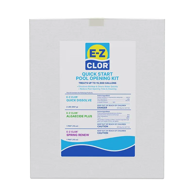 The Quick Start Pool Opening Kit was designed to make spring opening easier than ever. Our kits contain a shock, a non-foaming algaecide and a water cleaner that helps dissolve waterline buildup and clarifies cloudy water quickly.